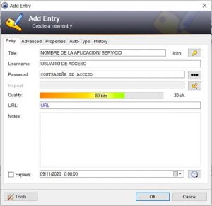 CLICAR, con el botón derecho en el panel derecho, y en el menú emergente clicar en ADD ENTRY. Aquí rellenáis los datos de acceso a la aplicación o servicios: nombre de la aplicación o servicio, usuario, contraseña y URL (ver imagen).